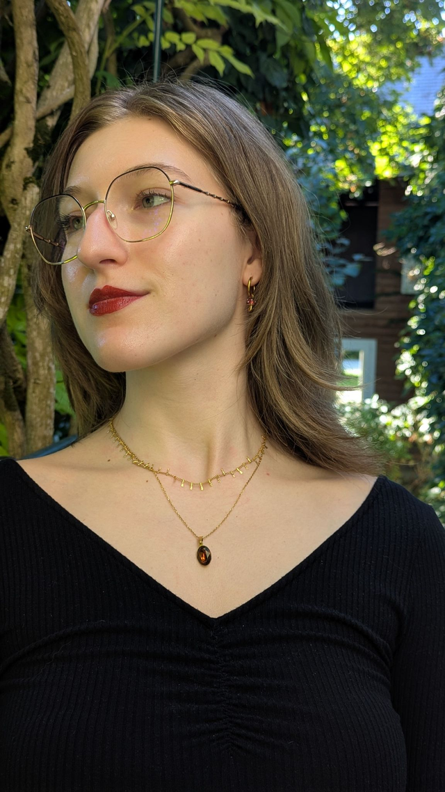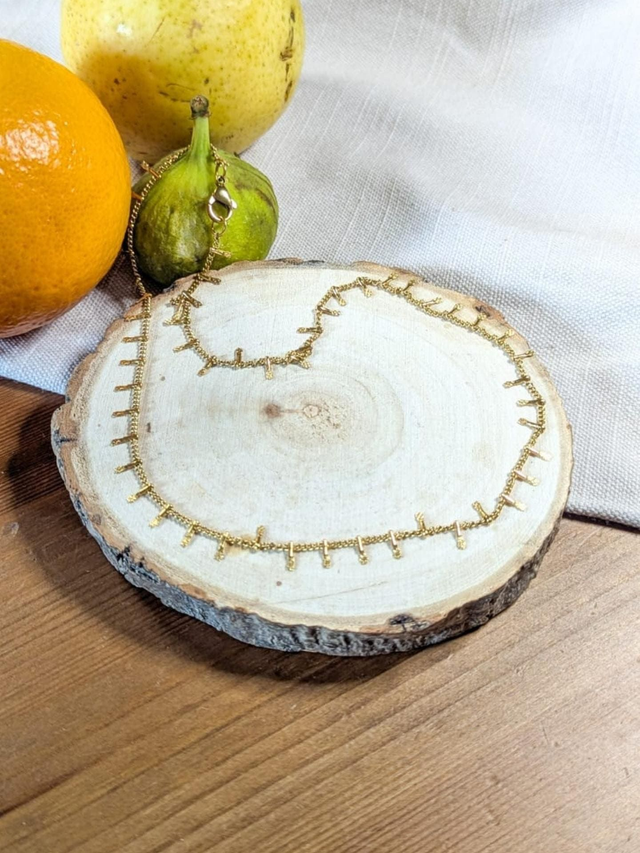 Avec ses mailles dorĂ©es et ses lignes texturĂ©es, le choker Écorce Ă©voque la force brute des arbres et la beautĂ© sauvage de la nature. Sa maille gourmette ponctuĂ©e de barres fines crĂ©e un rythme Ă©lĂ©gant, Ă  la fois moderne et organique. PiĂšce affirmĂ©e de la collection SƓurs d’automne, il incarne la protection et la puissance des sous-bois. RaffinĂ© et intemporel, il se porte seul pour affirmer son caractĂšre ou en superposition avec le collier Aube pour sublimer l’éclat.