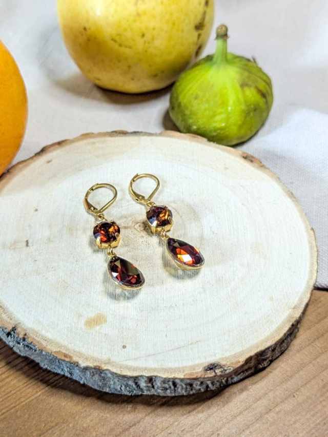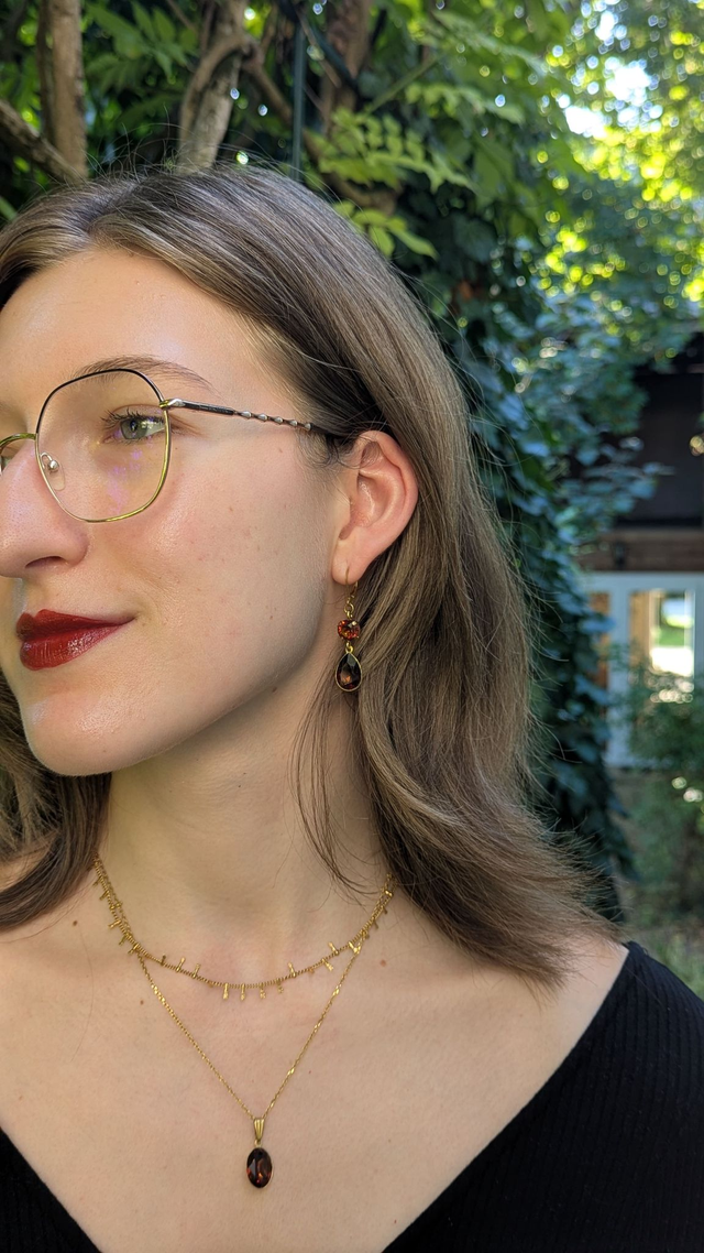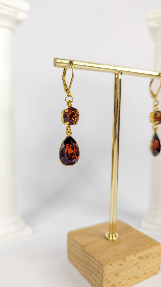 Acier inoxydable 304L – Dorure Or 18K (750/1000), placage PVD. Cristaux de verre taillés couleur ambre, serti en laiton