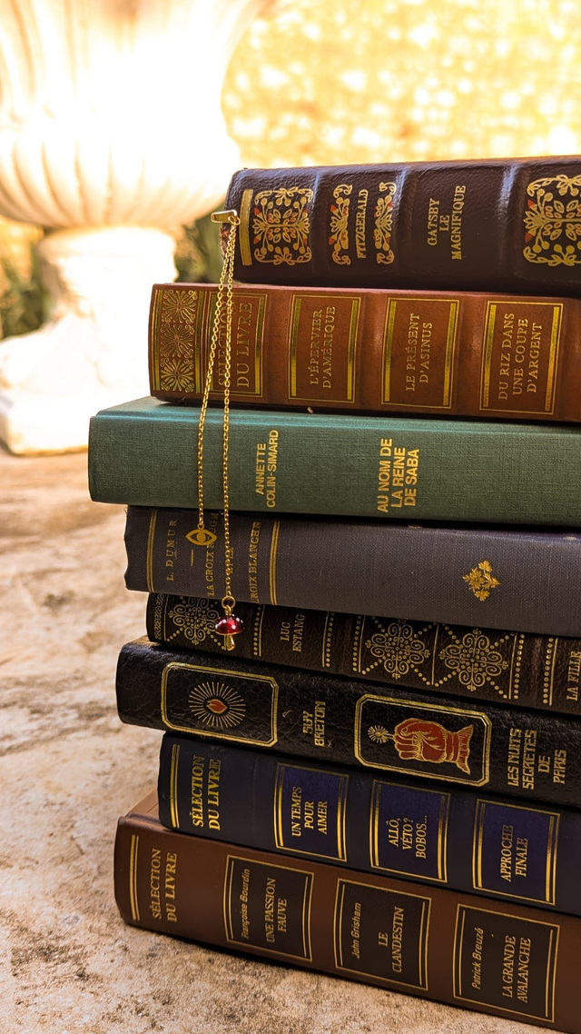 Sous la lumière dorée d’un matin, un petit champignon rouge veille sur tes pages comme un gardien des songes.